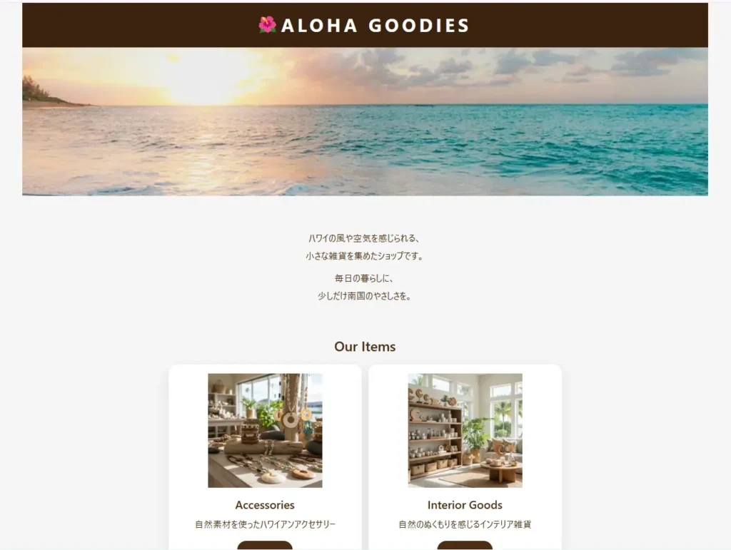 「Aloha Goodies」は、Next.js 版で制作した EC サイト構成を WordPress(PHP)で再構築した作品です。